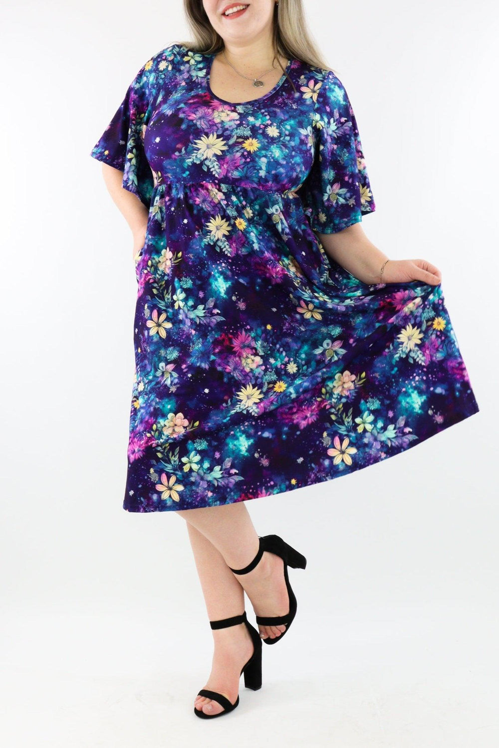 Galaxy Flowers - Midi Length Dress - Mid Sleeve - Pockets
