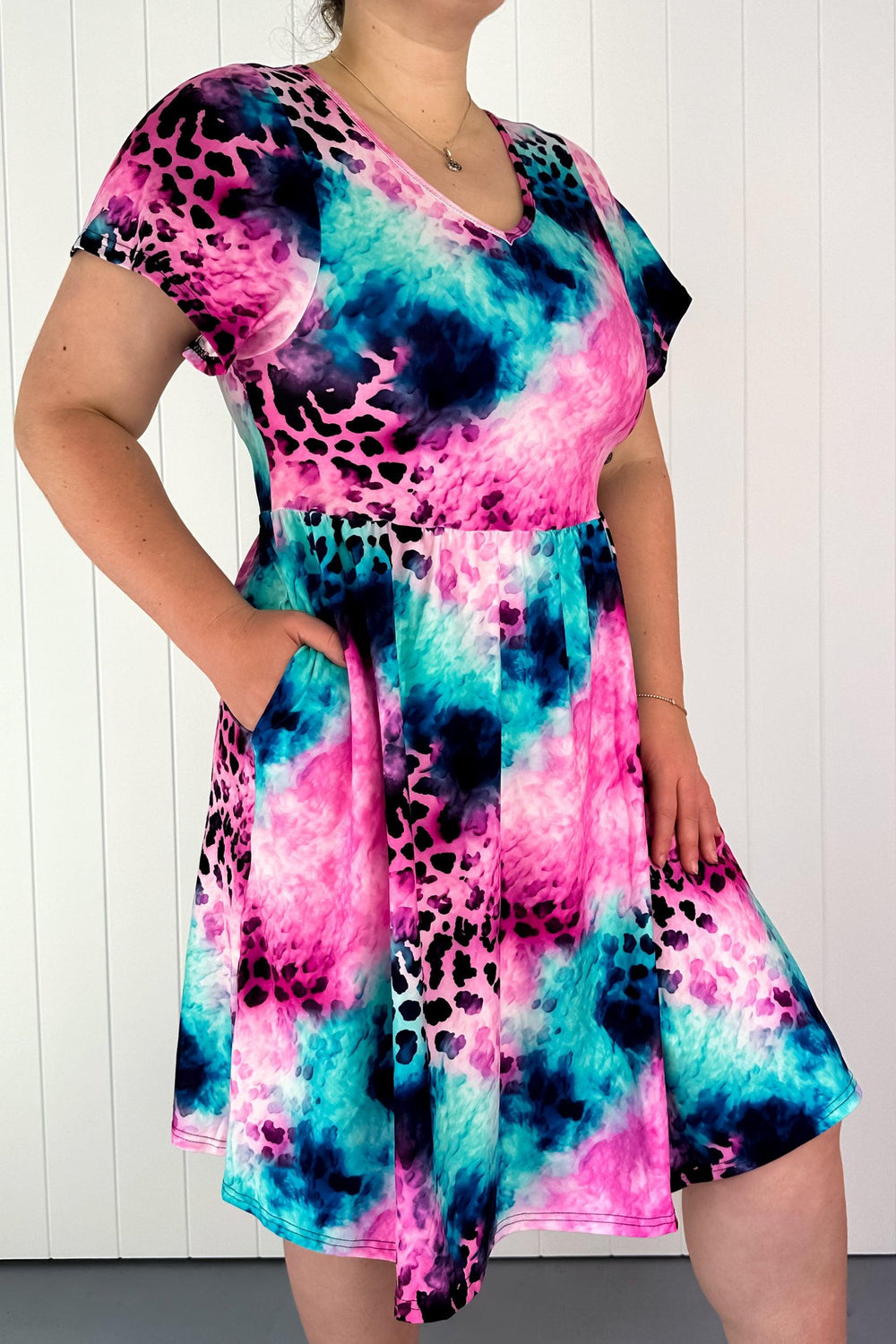 Leopard Ink - Flutter Sleeve Skater Dress - Knee Length - Pockets