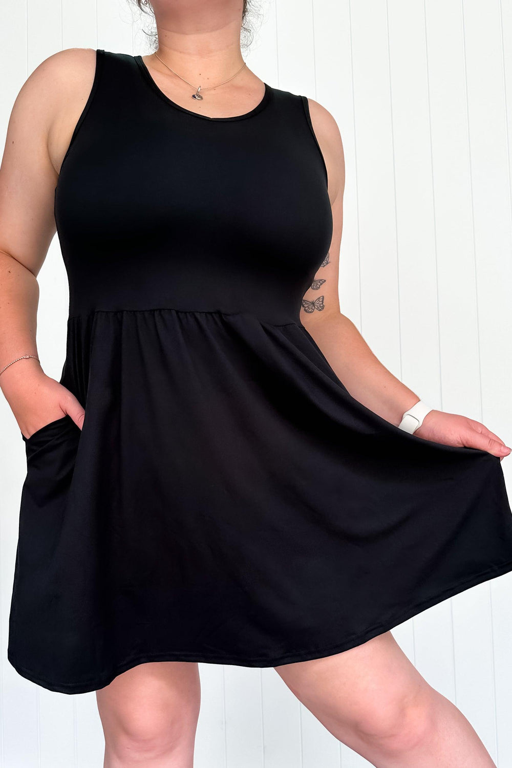 The Black Sleeveless Mini Dress with Pockets is your new go-to little black dress. Whether you dress it up with jewellery or keep it casual with sneakers, this clean black design does it all. Soft, comfy, and minimal decisions required, except for choosing which earrings to pair of course.
