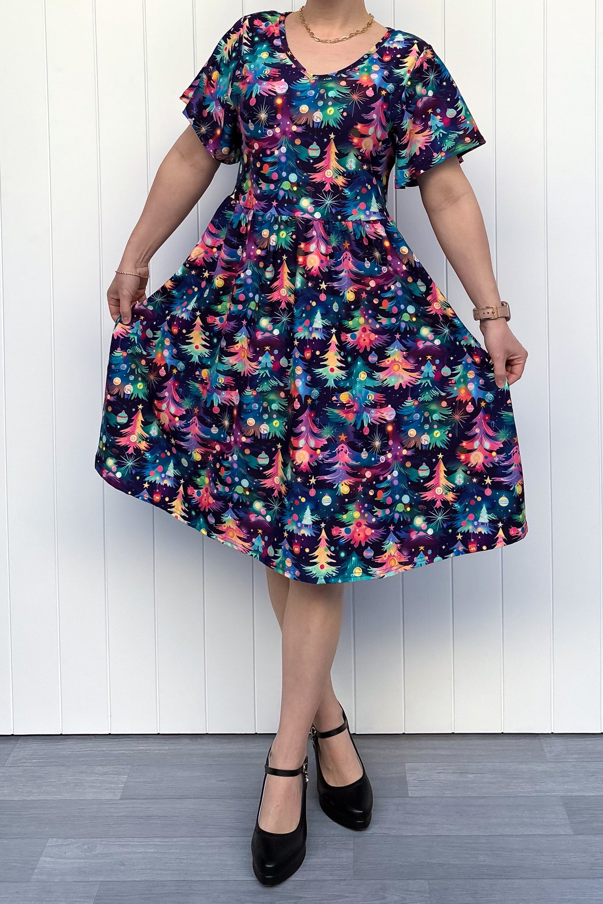 Person wearing a dress with a pattern of colourful Christmas trees against a white wooden panel background.