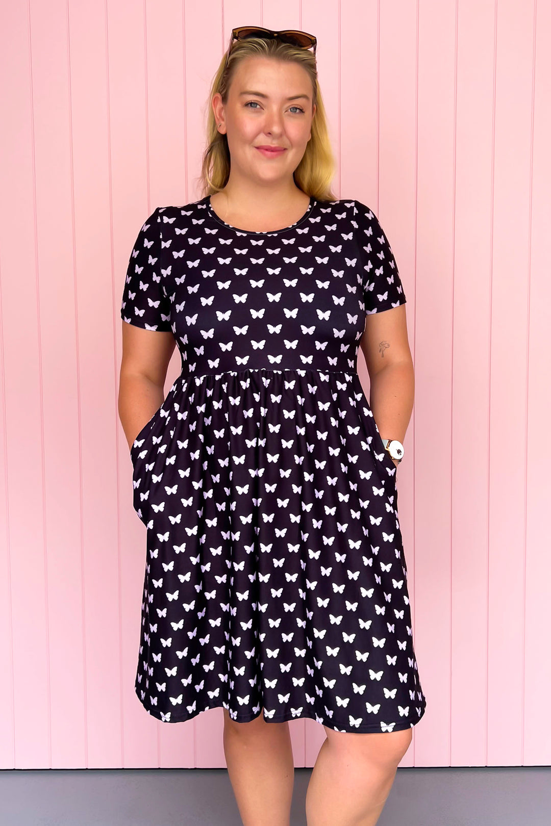 Our Butterfly Imprint Knee Length Dress is for when you love butterflies, but you also love wearing black. The addition of soft lilac butterflies adds just enough fun to brighten your mood, while the black background keeps this dress sleek enough to style with just about anything. And if you're someone that prefers wearing shorts under your dress for extra comfort, you can pair it with the matching shorts*.
