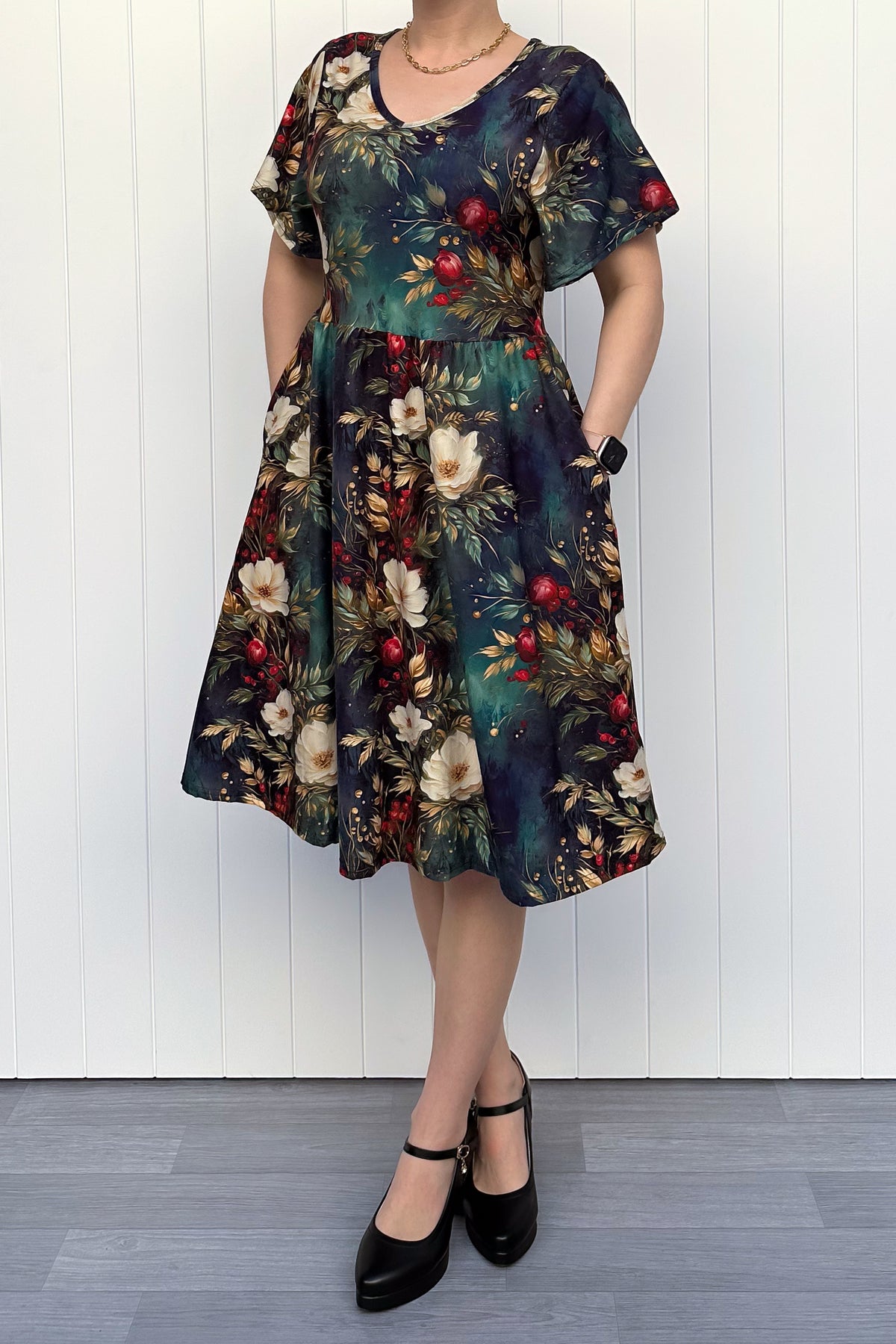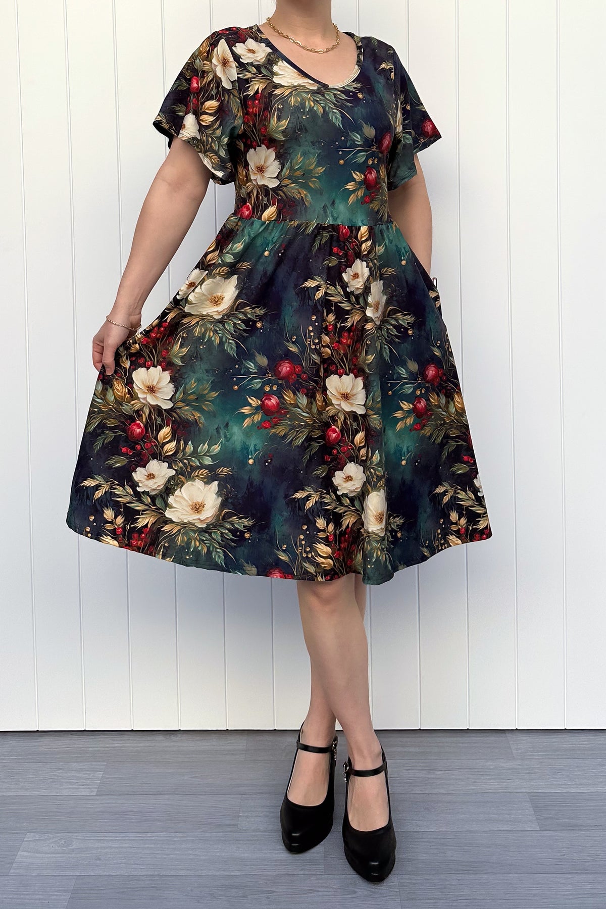 The Gilded Seasons Knee-Length Dress is where festive meets dark mystery, blending deep tones with golden leaves, ruby berries and soft cream blooms. It’s for the ones who trade bright red tinsel for candlelight and glitter for a quiet shimmer. Sophisticated, comfortable and beautifully different.