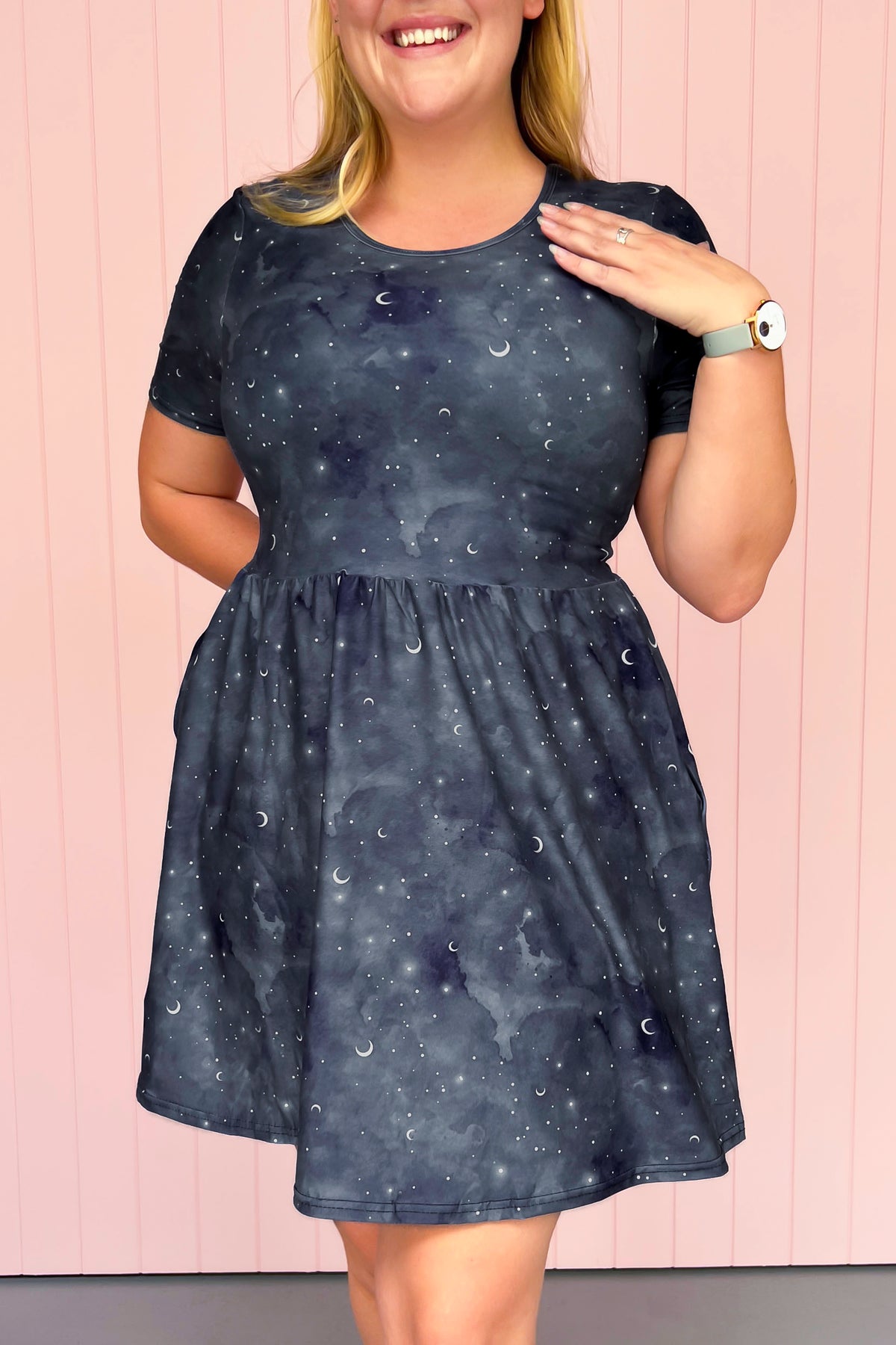 You don’t need a NASA-grade telescope to enjoy the beauty of the night sky, you just need the Midnight Dreams Mini Dress. Featuring a midnight-cloud inspired background of navy and blue, scattered with stars and crescent moons that make it feel as special as a quiet evening under the stars. And if you're someone that prefers wearing shorts under your dress for extra comfort, you can pair it with the matching shorts*.