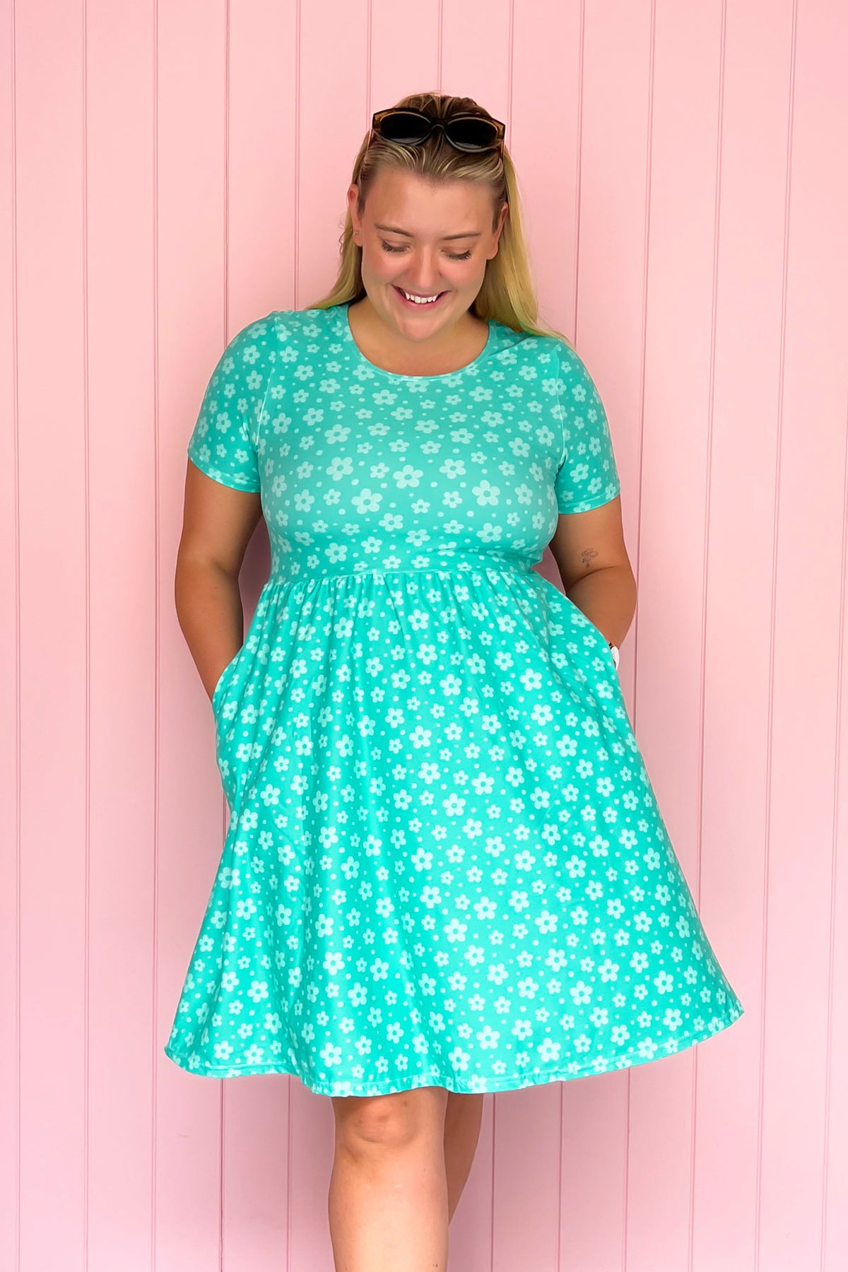 Turquoise Daisy Confetti - Knee Length Dress - Short Sleeve - Pockets