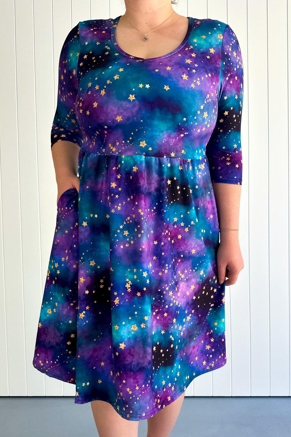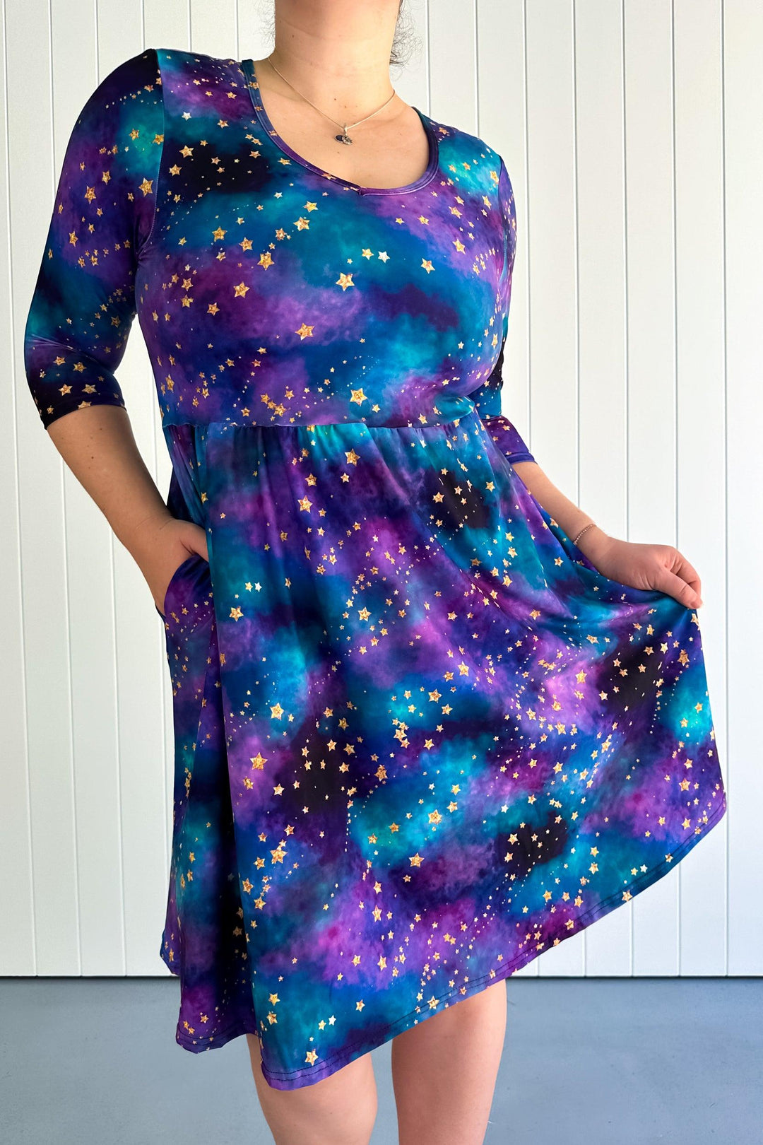 Universe Shimmer Skater Dress features a stunning blue and purple cloud-like pattern with printed gold stars. Designed with 3/4 length fitted sleeves, invisible pockets, and a v neck-line, in a knee length a-line style.